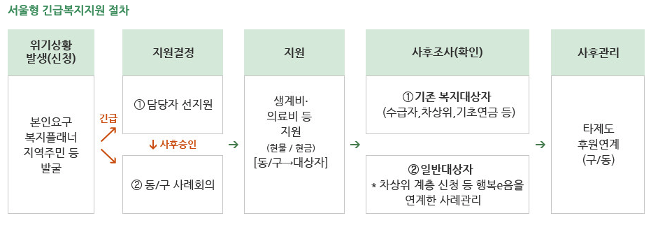 1. 위기 신고(다산콜센터 120 또는 동주민센터) -> 2. 위기상황 확인 (동주민센터) ->3. 동사례회의 개최 (지원여부 및 지원항목 결정) -> 4. 지원 ->5. 사후관리