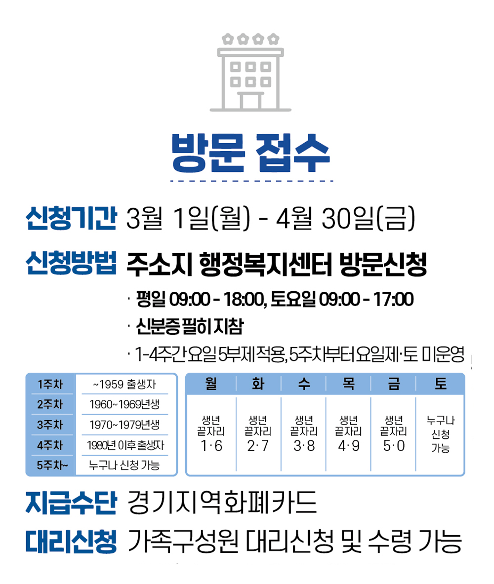 경기도는 코로나19 확산 방지를 위해 주민등록등본 상 출생연도를 기준으로 신청 가능한 주간을 구분하여 운영하고, 요일별 5부제를 적용하여 현장의 혼잡을 최소화할 계획입니다.