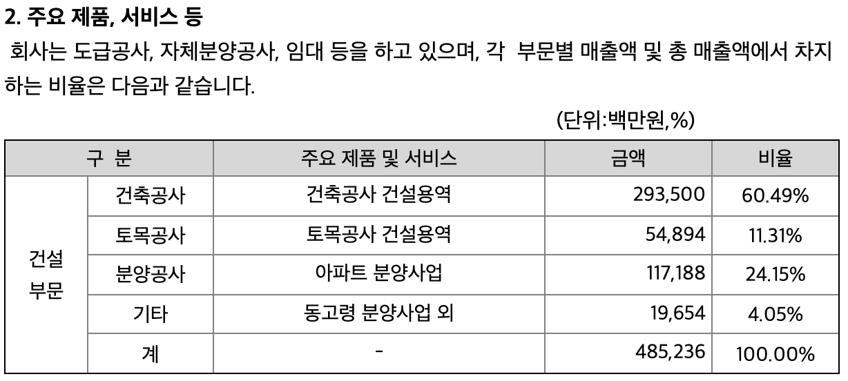 건축공사 건설용역이 60%의 매출을 차지하고 있고 아파트 분양사업이 다음으로 24%가량을 차지하고 있습니다. 향후 부동산대책, 경기활성화 정책 등과 엮어서 생각할 필요가 있는 기업입니다.