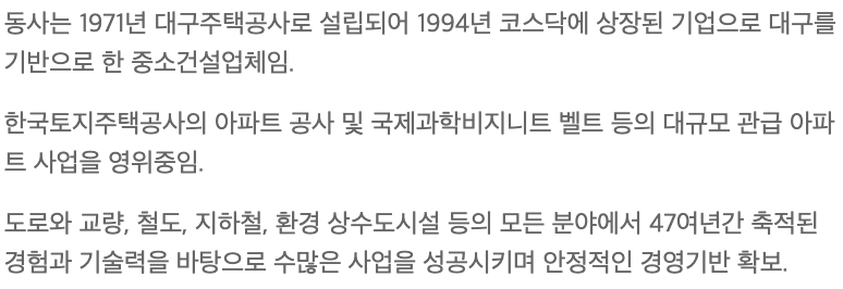 매출액 감소, 영업이익 감소 등을 보이고 있습니다. 토목, 건설 관련 공사 수주에 의존하고 있기 때문에 테마로 인한 단기 모멘텀 외에는 매력적으로 보이지 않습니다.