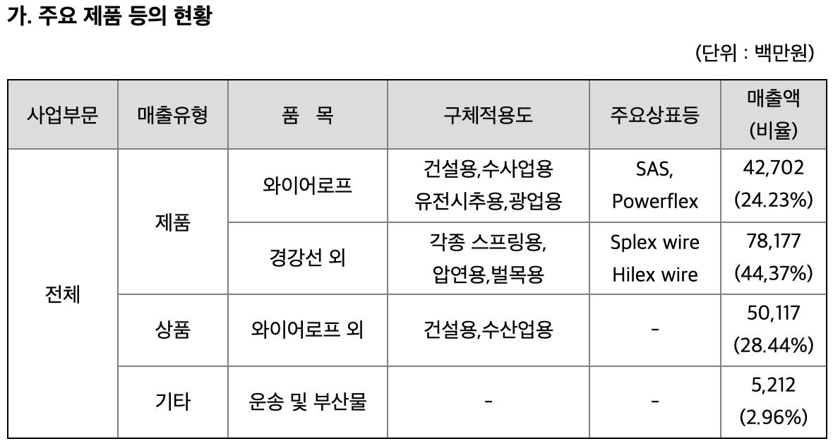 중간산업재로 쓰이는 선재를 가공하여 와이어로프, 경강선을 제조하고 있습니다. 자동차, 광산, 기계, 선박, 건설, 조선 등 다양한 범위에서 쓰이는 만큼, 경기민감주로 분류할 수 있을 것 같습니다.