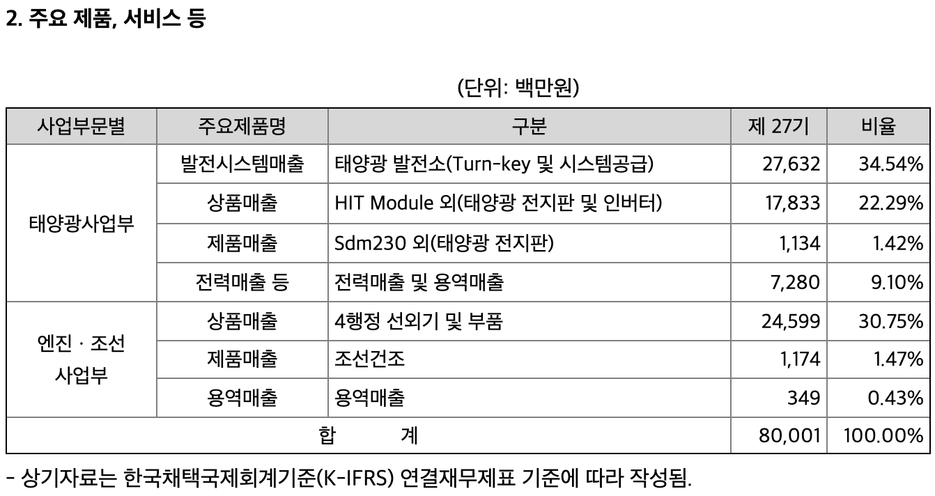 국내 선외기 시장에서 2020년 매출 기준으로 33%의 시장 점유율을 차지하면서 1위 자리를 굳히고 있습니다. 또한 태양광 사업에서 두각을 나타내고 있습니다.