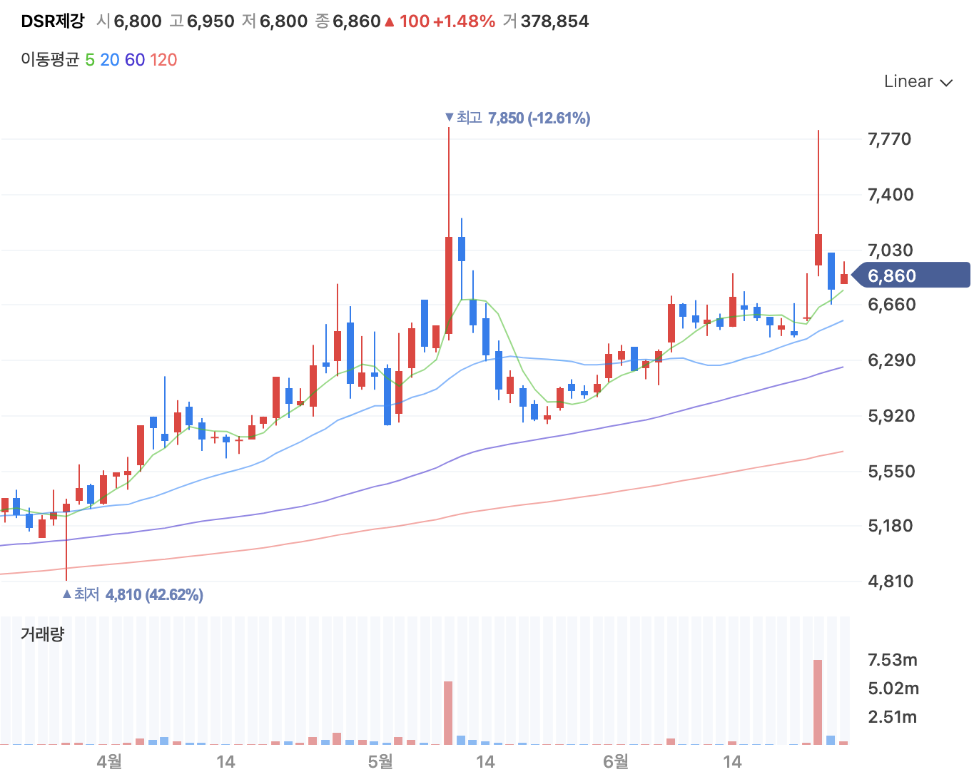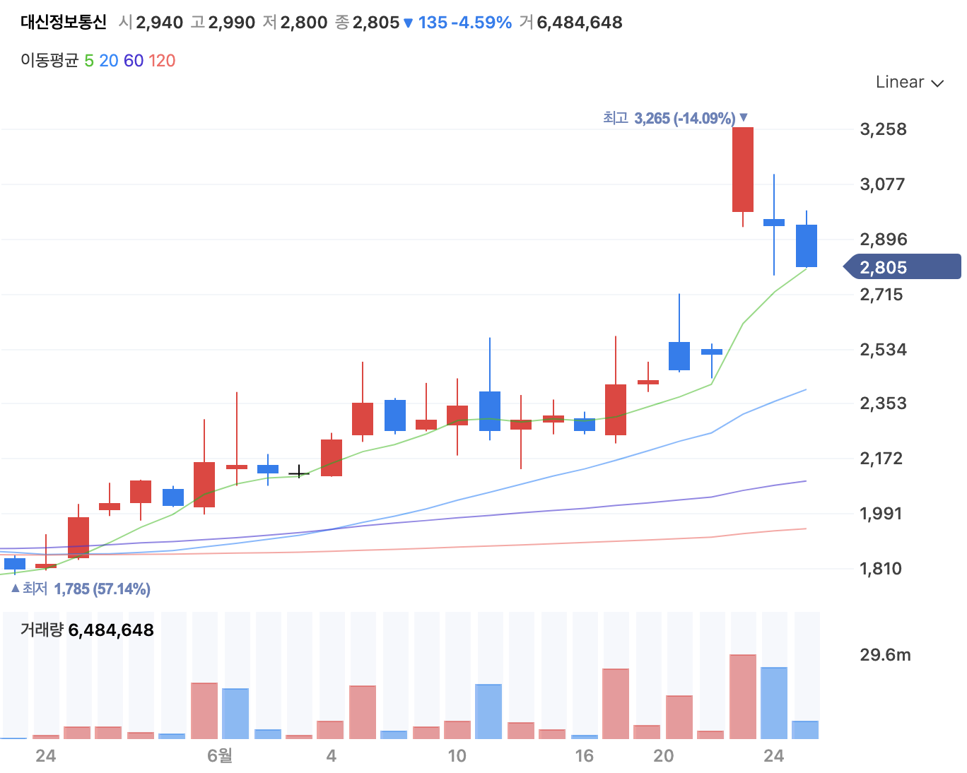 2020년 3월 이후에 꾸준히 우상향을 그리고 있습니다. 23일에 장대양봉이 발생했고 이후 하락했습니다. 장기적으로 우상향을 하고 있는 만큼, 이격도를 좁히고, 주가를 지지해주는 것을 본 후 진입을 고려해보는 것이 좋을 것 같습니다.