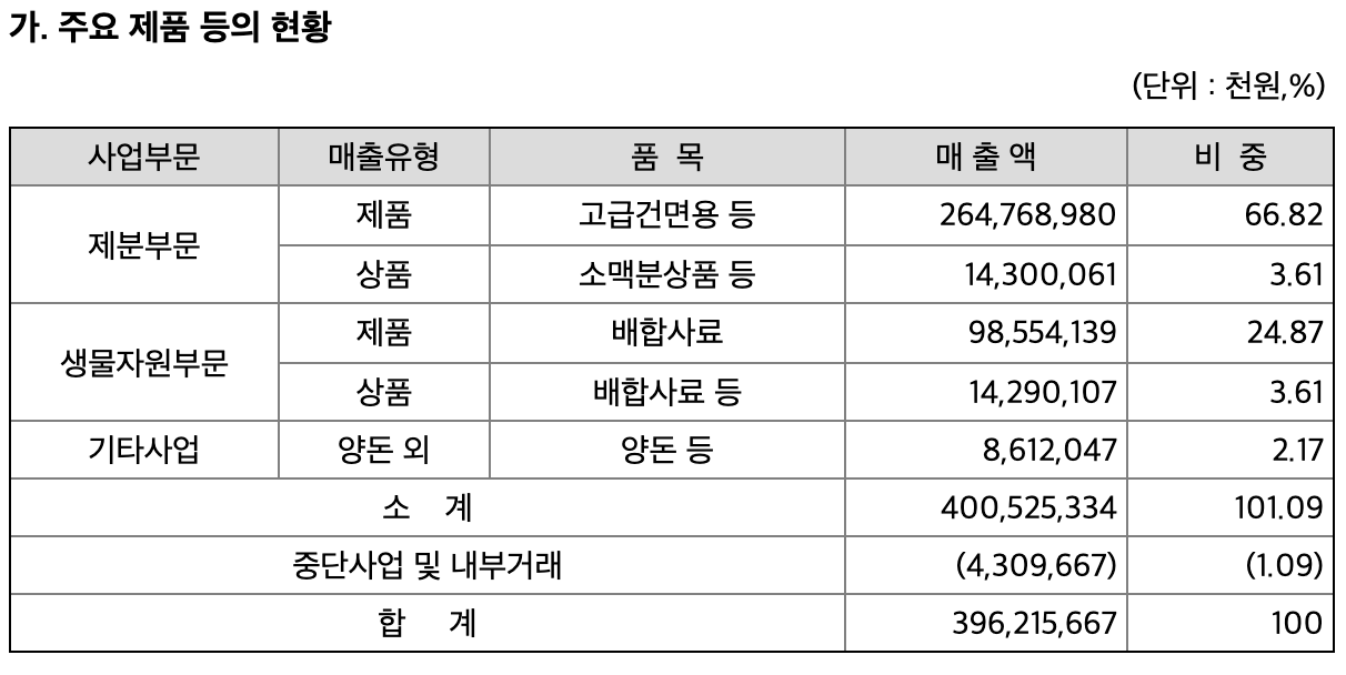 참치캔으로 유명한 사조그룹에 속해있고, 제분과 생물자원 부문 상업을 영위하고 있습니다.