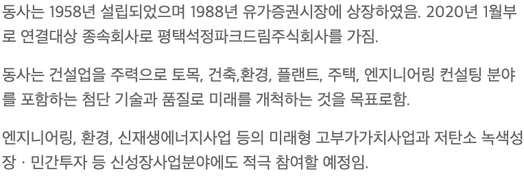 국내 건축도급공사가 사업의 90%정도를 차지하고, 국내 토목공사가 10%정도를 차지하는 내수기업입니다.